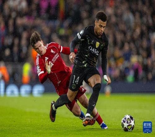 利物浦球員凱爾凱茲(左)與巴黎圣日耳曼球員杜埃拼搶(圖據(jù)新華社)