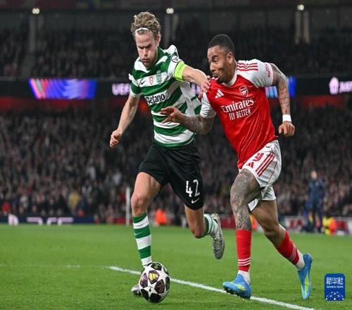 阿森納球員熱蘇斯(右)與葡萄牙體育球員尤爾曼拼搶(圖據(jù)新華社)