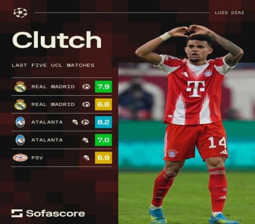 據(jù)Sofascore統(tǒng)計(jì),迪亞斯近5場(chǎng)歐冠比賽皆參與進(jìn)球,5場(chǎng)比賽總計(jì)打進(jìn)3球,助攻3次。