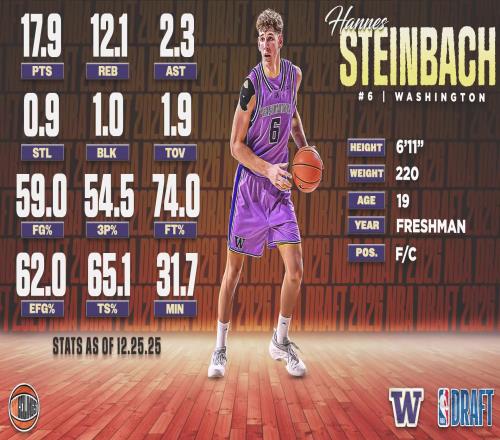 施泰因巴赫現(xiàn)年19歲,身高2米11,體重約100公斤,司職大前鋒/中鋒,他在華盛頓大學表現(xiàn)出色,堪稱兩雙機器,榮膺NCAA籃板王(場均11.8個)。選秀行情方面,施泰因巴赫有機會在樂透區(qū)(前14順位)被選中。