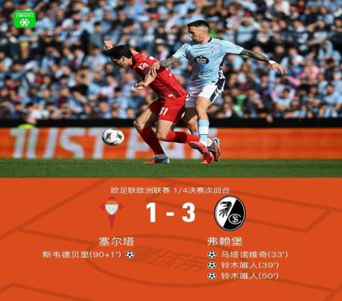 北京時(shí)間4月17日歐足聯(lián)歐洲聯(lián)賽 1/4決賽次回合,塞爾塔對(duì)陣弗賴堡。上半場(chǎng)馬塔諾維奇首開記錄,隨后鈴木唯人破門擴(kuò)大比分,下半場(chǎng)鈴木唯人梅開二度,補(bǔ)時(shí)階段斯韋德貝里扳回一球。最終比分弗賴堡3-1塞爾塔,兩回合總比分弗賴堡6-1塞爾塔晉級(jí)。