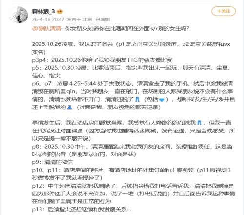 體育播報04月16日宣 微博用戶“森林狼_3”實名指控《王者榮耀》重慶狼隊選手清清(吳金翔)于2025年10月KPL賽事期間涉嫌性騷擾!事件核心細節(jié)包括清清脫掉下半身衣物想要強行發(fā)生關(guān)系、限制女方人身自由及事后推卸責任等行為。