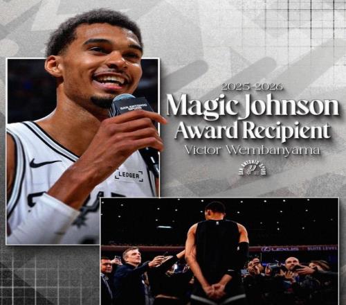 馬刺更衣室有個傳統(tǒng):新秀必須學怎么面對鏡頭。文班亞馬這賽季把這項技能點滿了——他剛拿下魔術(shù)師約翰遜獎,一個專門獎勵「球打得好+媒體配合度高」的冷門榮譽。