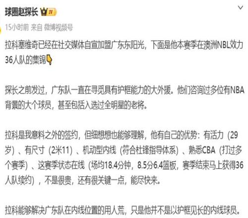 其次,據(jù)“趙探長”的報道,在薩姆納、薩林杰養(yǎng)傷期間,廣東隊一直在尋覓具有護框能力的大外,還咨詢過多位有NBA背景的大個球員,甚至包括入選過全明星的老將,但選來選去,廣東隊最終還是確定了護框能力不是那么強的拉科,一方面是便宜,另一方面是他能盡快來。
