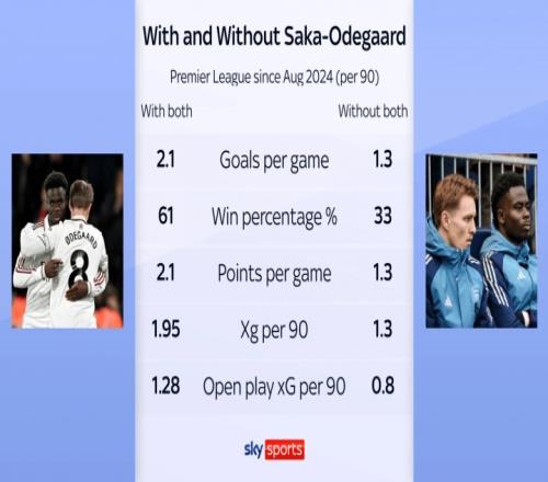 天空體育數(shù)據(jù)統(tǒng)計顯示,自2024年8月以來,當(dāng)薩卡和厄德高同時出戰(zhàn)時,阿森納英超場均打進(jìn)2.1球、勝率61%、場均2.1分、預(yù)期進(jìn)球值1.95、運(yùn)動戰(zhàn)預(yù)期進(jìn)球值1.28。