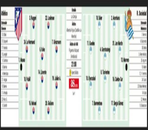 馬競:穆索;莫利納,勒諾爾芒,普比利亞,魯杰里;朱利亞諾·西蒙尼,略倫特,科克,盧克曼;阿爾瓦雷斯,格列茲曼