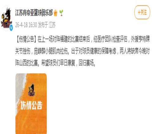 北京時(shí)間4月18日,江蘇男籃官宣最新的傷病報(bào)告,球隊(duì)后場(chǎng)雙核龐崢麟與亨特均是遭遇傷病侵襲,他們均將缺席本日與山西男籃的比賽。