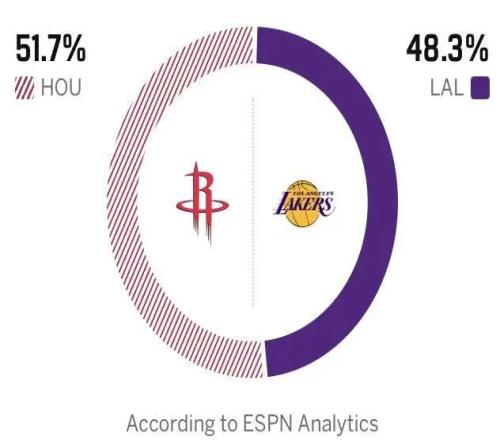 知名美媒ESPN預測G1火箭勝率51.7%,湖人則是48.3%。