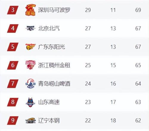 第6-9名球隊(duì)排名和上一輪相比保持不變,浙江65分領(lǐng)先青島、山東繼續(xù)穩(wěn)居第6,青島、山東分列第7、第8,山東63分領(lǐng)先遼寧1分,遼寧仍是第9,遼寧還有機(jī)會(huì)沖擊前八,但主動(dòng)權(quán)已經(jīng)不在他們這邊了(除非最后2場(chǎng)山東全敗,遼寧全勝)。