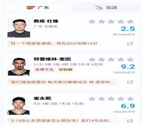 這場比賽結(jié)束后,超過1.4萬的球迷對球員進(jìn)行了評分,杜鋒和杜潤旺的評分最低,只有2.5分和2.6分。杜鋒的問題就不多說了,這段時間球迷們已經(jīng)討論得夠多了,他在戰(zhàn)術(shù)和用人方面非常固執(zhí)。杜潤旺作為一名投手,這場比賽打了16分鐘沒有得分進(jìn)賬,而且防守的問題非常明顯,在場上幾乎可以說是負(fù)作用了,評分比較低也很正常。另外小將陳家政這場比賽的表現(xiàn)也不好,防守端的問題很大,接下來需要好好總結(jié)。