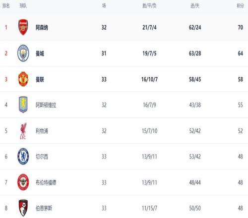 在積分榜上,阿森納以70分高居榜首,戰(zhàn)績是21勝7平4負(fù)。曼城排名第2,拿到了64分。曼城落后6分。接下來阿森納與曼城的直接對決將極大地影響到冠軍的歸屬。曼聯(lián)贏球之后,總積分達(dá)到58分,排名第3。第4的是阿斯頓維拉,拿到55分。利物浦以52分排名第5。切爾西輸球之后,依然是48分,排名第6,爭五前景有點(diǎn)悲觀。熱刺只拿到31分,排名倒數(shù)第3,陷入降級區(qū)。
