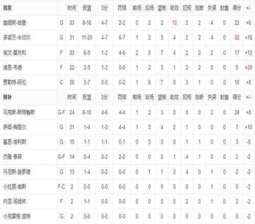 此役哈登全場比賽33分鐘,18中8,三分7中4,罰球2中2,拿到22分10助攻2籃板2搶斷,命中率44.4%,三分命中率57.1%,真實(shí)命中率58.3%,正負(fù)值+6。