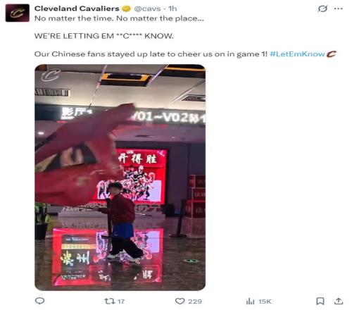 賽后騎士官方致謝中國球迷的應(yīng)援,在江蘇省常州市有中國球迷包下電影院直播騎士VS猛龍的首輪G1,還有一位小球迷拿著騎士的旗幟揮舞著。