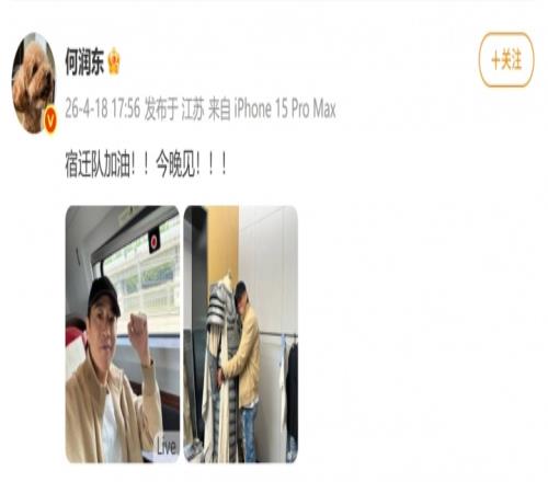 何潤東也于今日下午抵達宿遷奧體中心,并在剛剛發(fā)布社媒,并寫到:宿遷隊加油!!今晚見?。?!