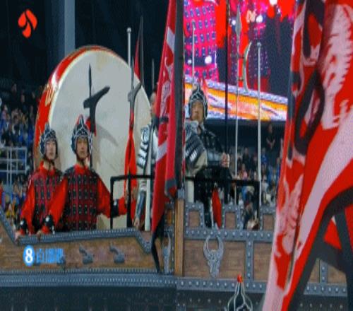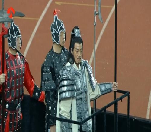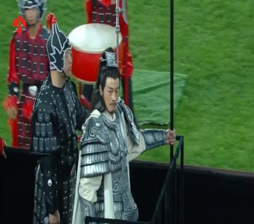 賽前暖場秀,演員何潤東以“項羽本羽”驚喜登場。為呼應(yīng)“項羽故里”,團隊特邀《楚漢傳奇》戰(zhàn)甲制作班底復刻霸王甲胄。何潤東身披“霸王戰(zhàn)甲”,乘古代戰(zhàn)車、執(zhí)長戟繞場一周,重現(xiàn)“霸王回歸”。
