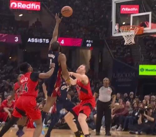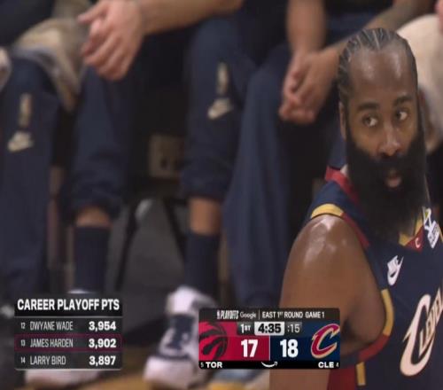 比賽首節(jié)7分39秒,騎士當(dāng)家球星哈登兩罰兩中,季后賽生涯得分來到3897分,追平拉里·伯德。