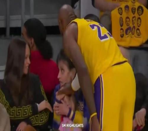 值得一提的是,在比賽過程中,前排的小女孩不慎被籃球砸到,詹姆斯上前去安慰小女孩,無疑是極為暖心一幕。
