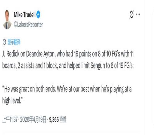 本賽季常規(guī)賽,艾頓一共14次得分20+,湖人戰(zhàn)績13勝1負。也就是說,頓寶砍下高分,湖人的勝率非常高。這也是為什么雷迪克說,當艾頓打出高水平,湖人處在最強形態(tài)。