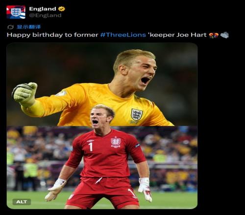 英格蘭隊官方社媒曬出喬·哈特效力時期的照片,配文:“祝前三獅軍團門將喬·哈特生日快樂。”
