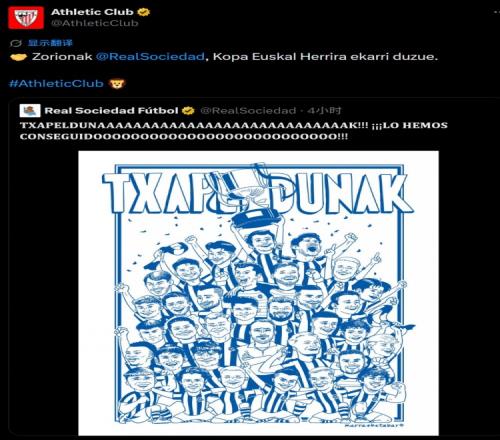 畢爾巴鄂競技官方社媒轉(zhuǎn)發(fā)皇社奪冠海報(bào),配文:“祝賀皇家社會(huì),你們將國王杯帶回了巴斯克地區(qū)?!?/p>