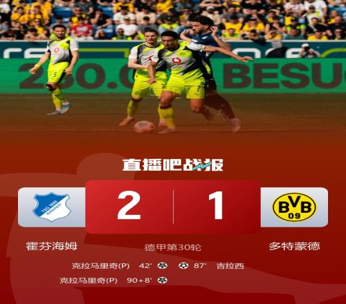 多特1-2霍村遭兩連敗,多特距離榜首拜仁12分,拜仁本輪打平即可奪冠。