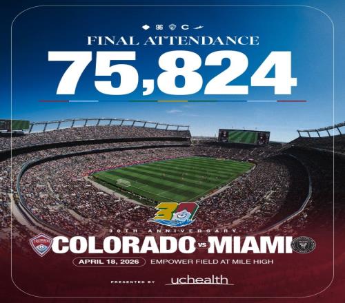 據(jù)科羅拉多急流(本場(chǎng)借用丹佛野馬隊(duì)球場(chǎng)進(jìn)行比賽)官方統(tǒng)計(jì),本場(chǎng)2-3邁阿密國(guó)際比賽的上座人數(shù)為75824人,刷新了隊(duì)史紀(jì)錄!另外美職聯(lián)官方的統(tǒng)計(jì)也表示,這場(chǎng)比賽是全美職聯(lián)歷史第二高上座人數(shù)的比賽!