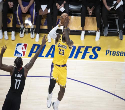 詹姆斯在對(duì)陣火箭的第一戰(zhàn)中表現(xiàn)非常出色。但這并非“一切”。他全場(chǎng)得到19分、13次助攻、8個(gè)籃板、2次搶斷和1次蓋帽,而且以+11的在場(chǎng)正負(fù)值領(lǐng)跑全隊(duì)。他表現(xiàn)驚艷,但十分克制。他只出手了15次。自加盟湖人以來(lái),在其他由個(gè)位數(shù)分差決出勝負(fù)的季后賽中,他只有兩場(chǎng)比賽的出手?jǐn)?shù)在15次或以下。而且他在防守端承擔(dān)的壓力相對(duì)較輕。
