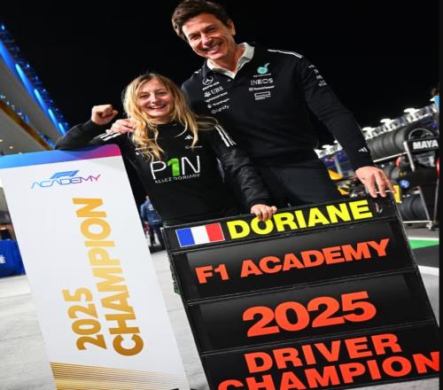 帶著這份浴火重生的心智,多瑞安在2025賽季火力全開,憑借8次登上領獎臺(包括4次冠軍)的優(yōu)異表現(xiàn),她在拉斯維加斯收官戰(zhàn)的雨夜亂局中以第五名的成績力壓法拉利青訓車手瑪雅·維格,成功加冕2025賽季F1學院總冠軍。