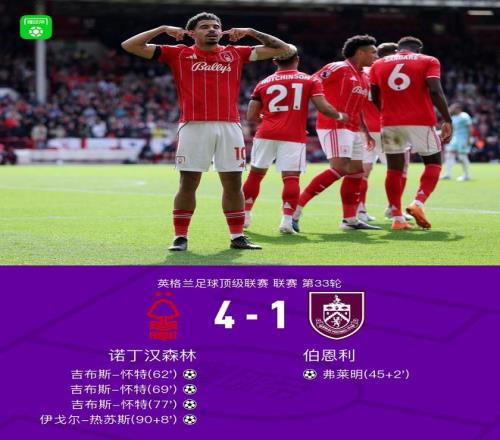 北京時(shí)間4月19日21:00,英超第33輪,諾丁漢森林主場(chǎng)對(duì)陣伯恩利。上半場(chǎng),沃德-普勞斯任意球攻門被撲出,穆里略傷退,半場(chǎng)補(bǔ)時(shí)階段,弗萊明推射破門。下半場(chǎng),吉布斯-懷特15分鐘連入3球上演帽子戲法,吉布斯-懷特是森林隊(duì)史第3位在英超戴帽的球員,伊戈?duì)?熱蘇斯補(bǔ)時(shí)階段錦上添花,最終,諾丁漢森林4-1逆轉(zhuǎn)伯恩利,33輪過(guò)后高出降級(jí)區(qū)5分。