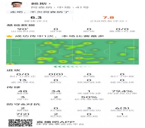 賴斯本場(chǎng)數(shù)據(jù):1次關(guān)鍵傳球,3次搶斷,2次解圍,5次成功對(duì)抗