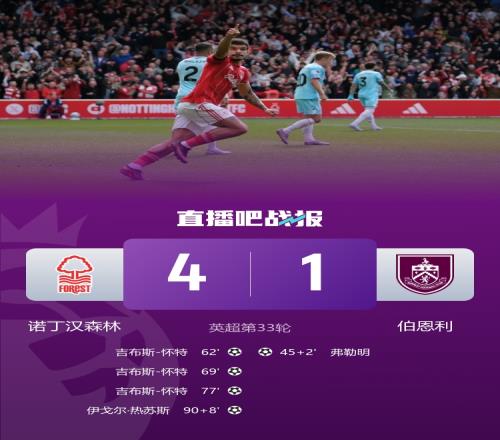 體育播報(bào)4月19日宣 北京時(shí)間21:00,英超第33輪諾丁漢森林vs伯恩利,比賽在諾丁漢城市足球場(chǎng)打響!賽前,森林為埃利奧特·安德森剛剛離世的母親舉行了紀(jì)念儀式。上半場(chǎng),穆里略傷退,弗勒明半場(chǎng)補(bǔ)時(shí)破門!下半場(chǎng),吉布斯-懷特上演帽子戲法!伊戈?duì)枴崽K斯98分鐘錦上添花!最終,森林4-1逆轉(zhuǎn)伯恩利,領(lǐng)先降級(jí)區(qū)的熱刺5分。