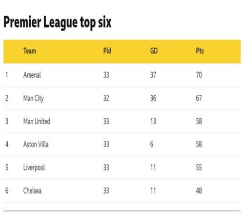 曼聯(lián)和維拉都領(lǐng)先切爾西10分之多,接下來的5場比賽里,只要拿到6分就能確保歐冠資格。