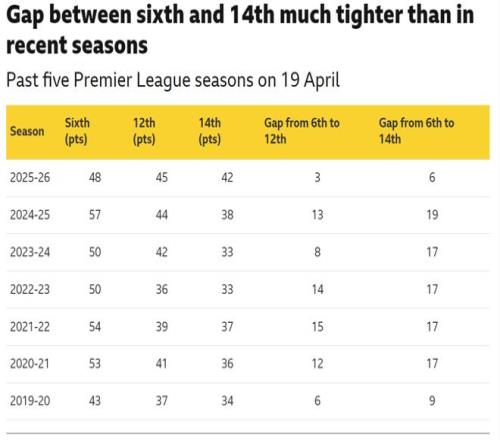 去年同期,英超第六名和第14名已經(jīng)有多達(dá)19分的分差,更早之前的三個(gè)賽季,則都是17分。在英超創(chuàng)立后的34個(gè)賽季中,4月19日時(shí)排名聯(lián)賽第六的球隊(duì)與排名第12的球隊(duì)之間的平均分差為13.3分;排名第六的球隊(duì)與排名第14的球隊(duì)之間的平均分差則為16.5分。