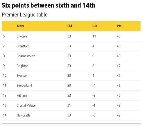 不過,這個(gè)賽季英超中游競爭激烈,第六名切爾西和第14名紐卡斯?fàn)柭?lián)之間只有6分差距。切爾西最近6場輸了5場,積48分與布倫特福德和伯恩茅斯相同。數(shù)據(jù)顯示,這確實(shí)是歷年來積分榜中游纏斗最激烈的一年!