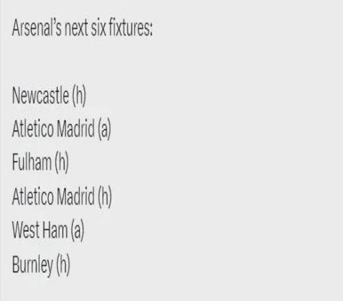 阿森納未來6場比賽:主戰(zhàn)紐卡斯?fàn)?、客?zhàn)馬競、主戰(zhàn)富勒姆、主戰(zhàn)馬競、客戰(zhàn)西漢姆、主戰(zhàn)伯恩利。
