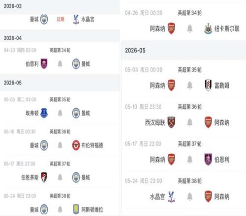 后續(xù)賽程的對比,更是讓爭冠懸念進一步升級。曼城將迎戰(zhàn)阿斯頓維拉,而阿森納則要對陣紐卡斯?fàn)柭?lián)。