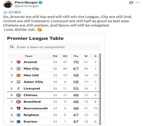作為知名槍迷,摩根在社媒發(fā)文力挺阿森納,他堅定表示:“阿森納依舊穩(wěn)居榜首,依然將贏得聯(lián)賽冠軍。曼城還是第二,曼聯(lián)依然無關(guān)緊要;利物浦還是實力只剩去年一半;切爾西依舊一無是處;熱刺依然遲早降級?!?/p>