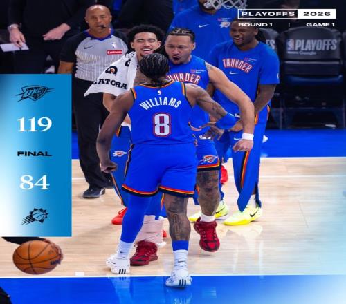 北京時(shí)間4月20日,NBA季后賽首輪G1,俄克拉荷馬雷霆以119-84狂勝菲尼克斯太陽(yáng)。這是一場(chǎng)毫無(wú)懸念的比賽,雷霆首節(jié)就領(lǐng)先15分,半場(chǎng)拉開(kāi)打21分,三節(jié)已經(jīng)領(lǐng)先31分,末節(jié)直接進(jìn)入垃圾時(shí)間。這就是聯(lián)盟第一+衛(wèi)冕冠軍的統(tǒng)治力。
