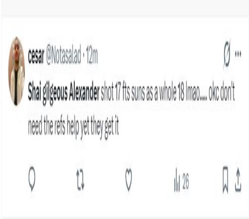美球迷:亞歷山大合計(jì)17個(gè)罰球,太陽(yáng)全隊(duì)18個(gè),這就是在開(kāi)玩笑。雷霆暫時(shí)不再需要裁判幫扶了,因?yàn)樗麄円呀?jīng)得到了裁判的青睞。