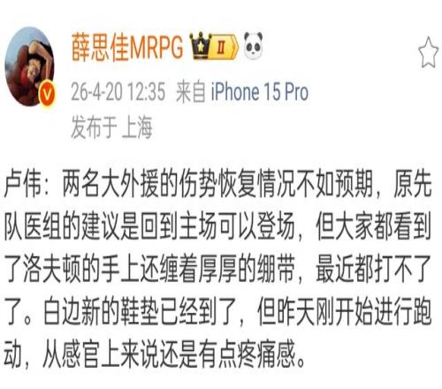 上海男籃拿到了常規(guī)賽冠軍,然而盧偉卻高興不起來,因為內線兩位外援洛夫頓和懷特塞德都出現(xiàn)了傷病情況,主場和遼寧男籃比賽之前,盧偉介紹了兩位外援的情況,他表示洛夫頓的情況不樂觀,短期內無法出戰(zhàn),常規(guī)賽確定報銷,季后賽第一輪能否回歸也不確定。