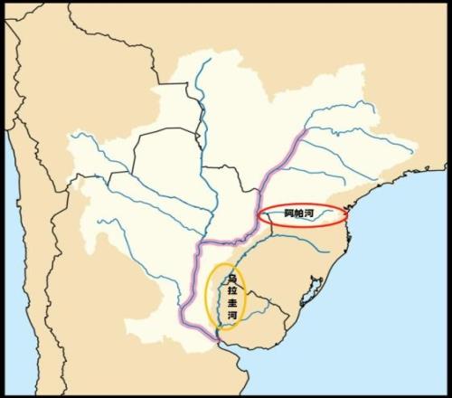 西班牙、葡萄牙競(jìng)爭(zhēng)的焦點(diǎn)阿帕河(紅色)和烏拉圭河(黃色)