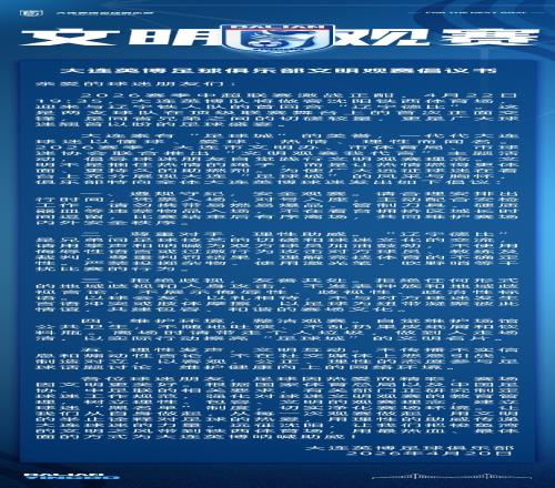 體育播報4月20日宣 4月22日,大連英博將在客場對陣遼寧鐵人。對于本場比賽,大連英博俱樂部官方發(fā)布了文明觀賽倡議書。