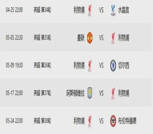 利物浦最后五輪的對(duì)手是:水晶宮(客)、曼聯(lián)(主)、切爾西(客)、維拉(主)、紐卡斯?fàn)枺停N鍒?chǎng)比賽四個(gè)客場(chǎng),三個(gè)對(duì)手是爭(zhēng)奪歐戰(zhàn)資格的直接競(jìng)爭(zhēng)者。