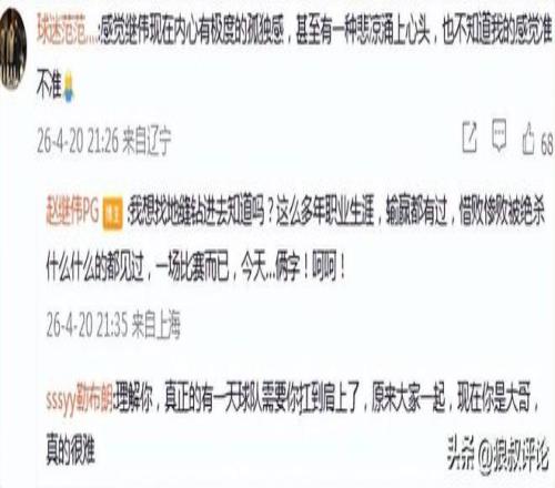 隨后,趙繼偉在社媒補充回應(yīng):“我想找地縫鉆進(jìn)去知道嗎?這么多年職業(yè)生涯,輸贏都有過,惜敗慘敗被絕殺什么什么的都見過,一場比賽而已,今天…倆字!呵呵!”。