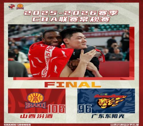 北京時(shí)間2026年4月20日19:35,2025-2026賽季常規(guī)賽第41輪繼續(xù)進(jìn)行,山西汾酒主場(chǎng)迎戰(zhàn)廣東東陽(yáng)光。兩隊(duì)歷史上共交手50次,山西汾酒10勝40負(fù)。上賽季兩隊(duì)交手7次,山西汾酒6勝1負(fù);本賽季兩隊(duì)交手2次,山西汾酒0勝2負(fù)。本場(chǎng)比賽,山西隊(duì)進(jìn)攻端多點(diǎn)開(kāi)花,全隊(duì)六人得分上雙,籃板球保護(hù)積極主動(dòng),但是對(duì)重點(diǎn)人的盯防仍需加強(qiáng)。末節(jié)關(guān)鍵時(shí)刻,本土球員挺身而出,接連得分幫助山西隊(duì)穩(wěn)住局面,拿下勝利。最終全場(chǎng)比賽結(jié)束,山西汾酒106:96戰(zhàn)勝?gòu)V東東陽(yáng)光。