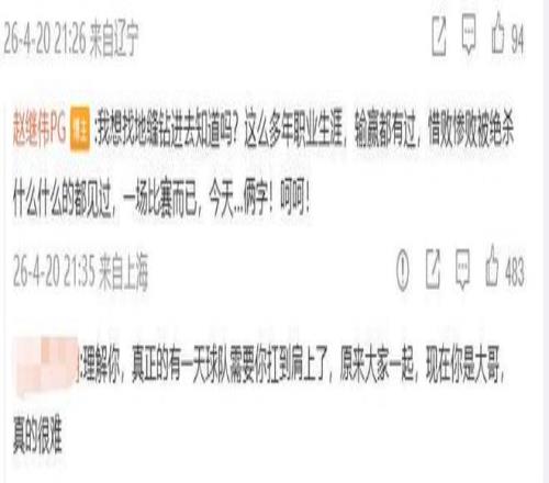 隨后繼偉還在評論區(qū)留言:我想找地縫鉆進(jìn)去知道嗎?這么多年職業(yè)生涯,輸贏都有過,惜敗慘敗被絕殺什么什么的都見過,一場比賽而已,今天…倆字!呵呵!繼偉今日如此反常,十分罕見,不知道是不滿隊(duì)友表現(xiàn)還是不滿裁判吹罰他技犯?