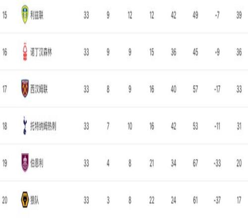 剩余1個降級席位,將在4隊之中產(chǎn)生。第15名(利茲聯(lián))、第16名(森林)、第17名(西漢姆)之間各差3分,這三隊的保級形勢較為樂觀。