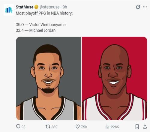 因?yàn)?2歲的文班亞馬首場(chǎng)季后賽就如此爆炸,數(shù)據(jù)媒體StatMuse用喬丹調(diào)侃他,數(shù)媒寫道:文班亞馬首秀35分,喬丹季后賽場(chǎng)均33.4分不及文班。