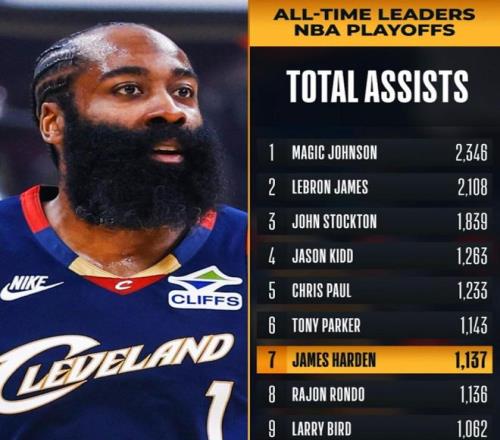 哈登在比賽第三節(jié)送出生涯第1137次助攻,成功超越隆多升至NBA歷史第7名!