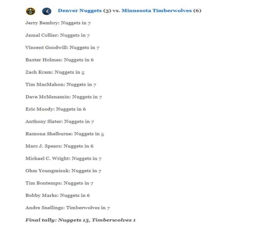 再回到這輪系列賽,賽前ESPN的預(yù)測(cè)里,16位專家里有15位看好掘金晉級(jí),但注意,有10人認(rèn)為是這輪系列賽要打七場(chǎng),你們覺得,這輪比賽最終誰能晉級(jí)?大比分會(huì)是多少呢?